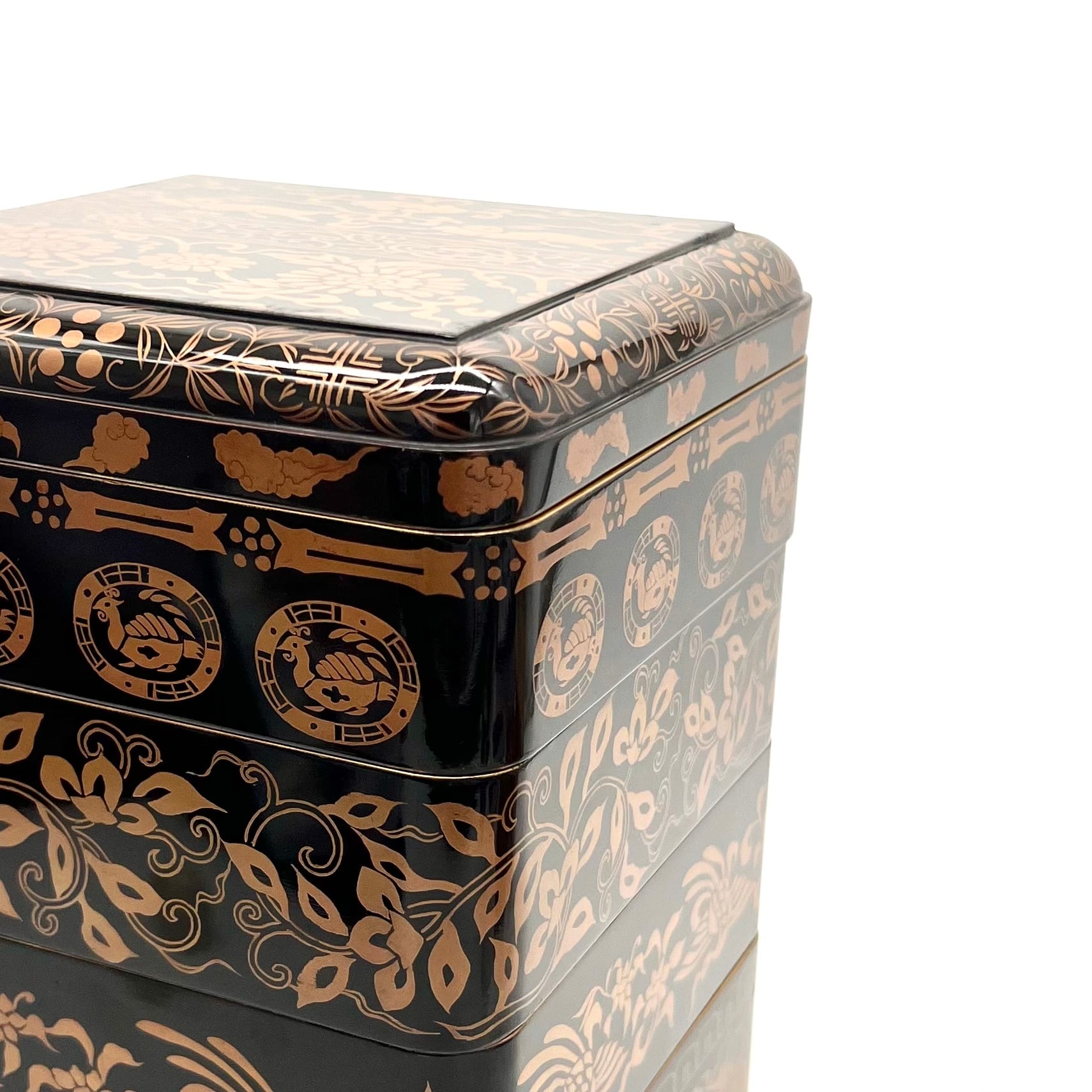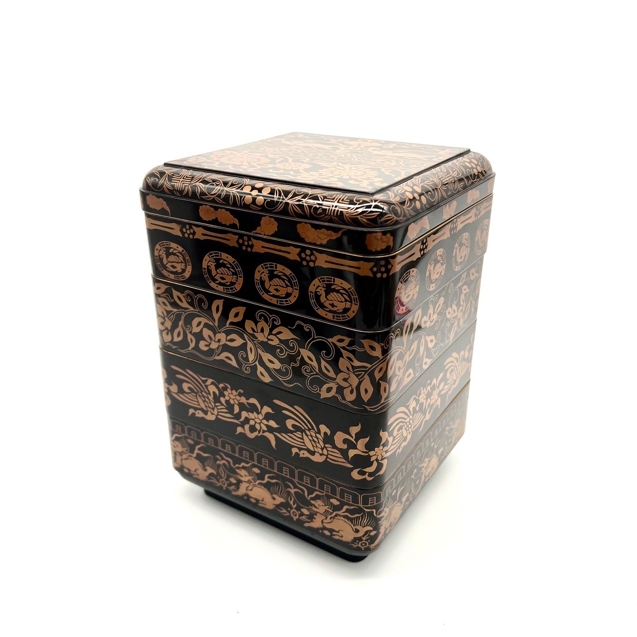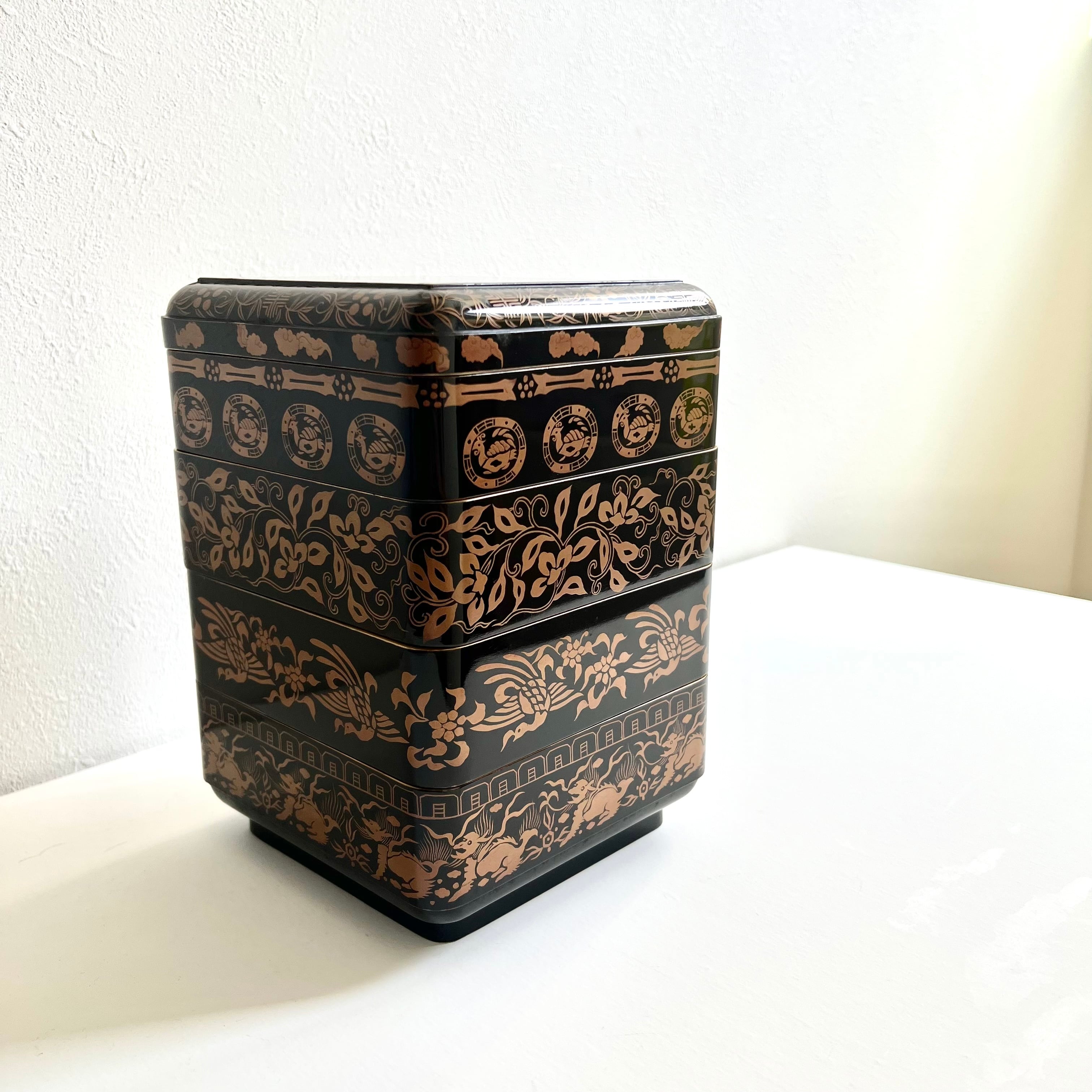 段ごとに蒔絵の柄が変わっており、とてもデザイン性に優れています。漆黒の黒から鮮やかに放たれる、朱雀や青龍などの吉祥的な四神やモダンでゴージャスな花唐草文様。写実的でなくパターン化されてデフォルメされて描くことによって、とても優美で素晴らしいモチーフとデザインに。