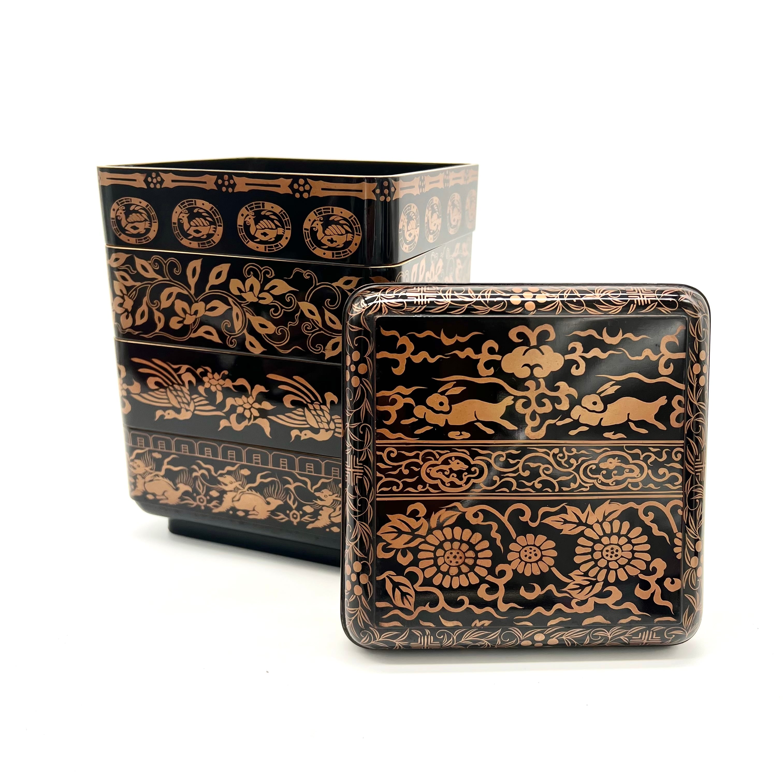 A lacquer four-tiered box .The exterior decorated in Hira-makie with four gods and flowers patterns.